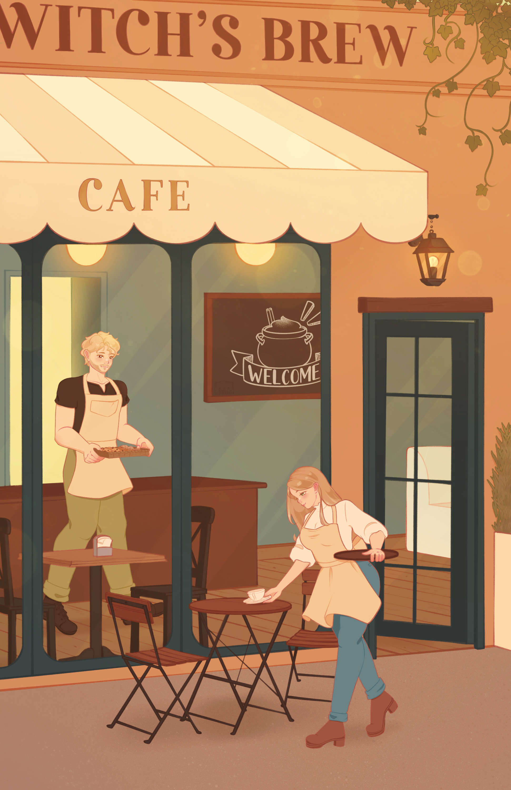Illustrations done for promotion purposes for the books Pumpkin Spice & Poltergeist, Lycans & Lattes and Curses & Cold Brew, commissioned by K. Elle Morrison in 2024-2025.They showcase the main characters in the places of interest of each book, all located in the town of Maple Hollow.